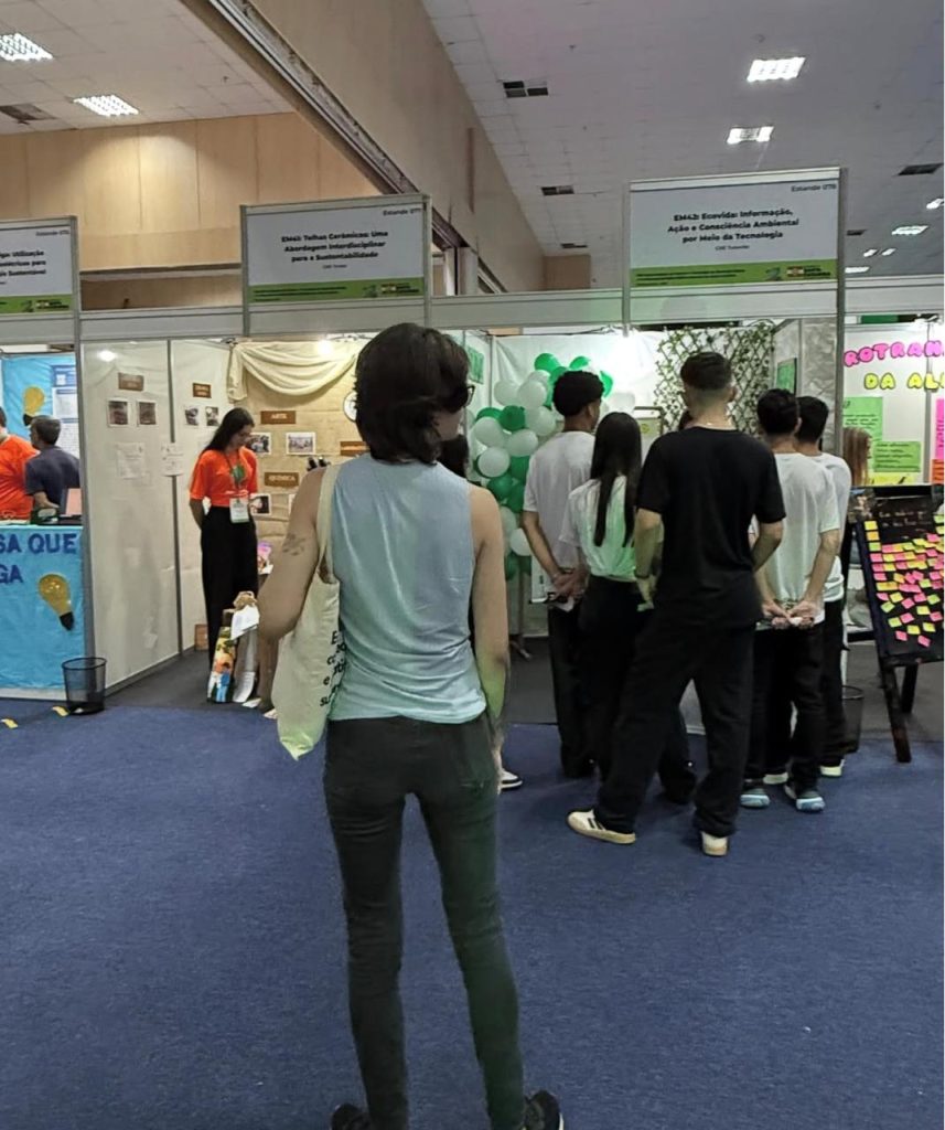 Assim, visita técnica da turma de habitats de inovação teve seu ponto final a FECITEC. A pausa na feira proporcionou a oportunidade de explorar os estandes e conhecer projetos inovadores desenvolvidos por crianças e adolescentes de várias regiões do Estado.